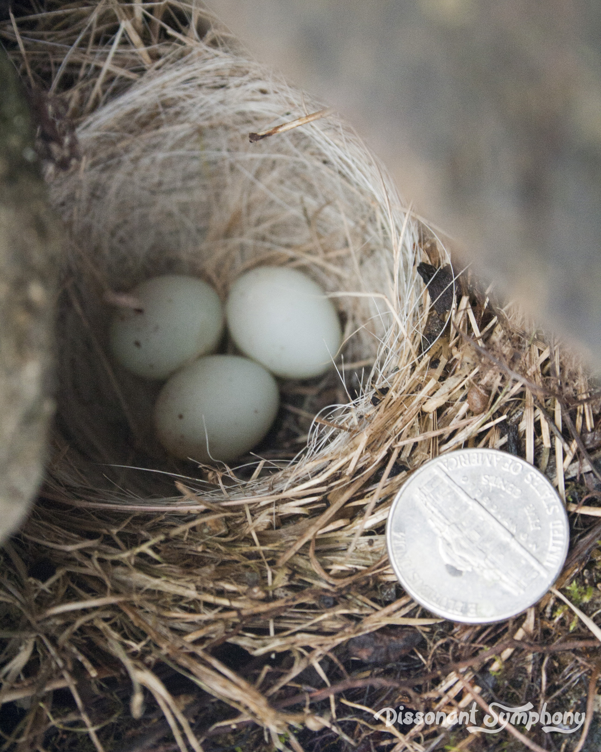 My only calming thought is that although the outside of the nest is wet from the rain last night, the interior is still nice and dry. That’s got to mean the momma was on the nest overnight…right? Ahhhgggg. Just two quick pictures today – one with a nickel to show some size comparison. Now I’m off to read my Bible and pray desperately that there’s a new egg tomorrow so I don’t have to explain to my children that Mommy ruined a little birdie’s family.