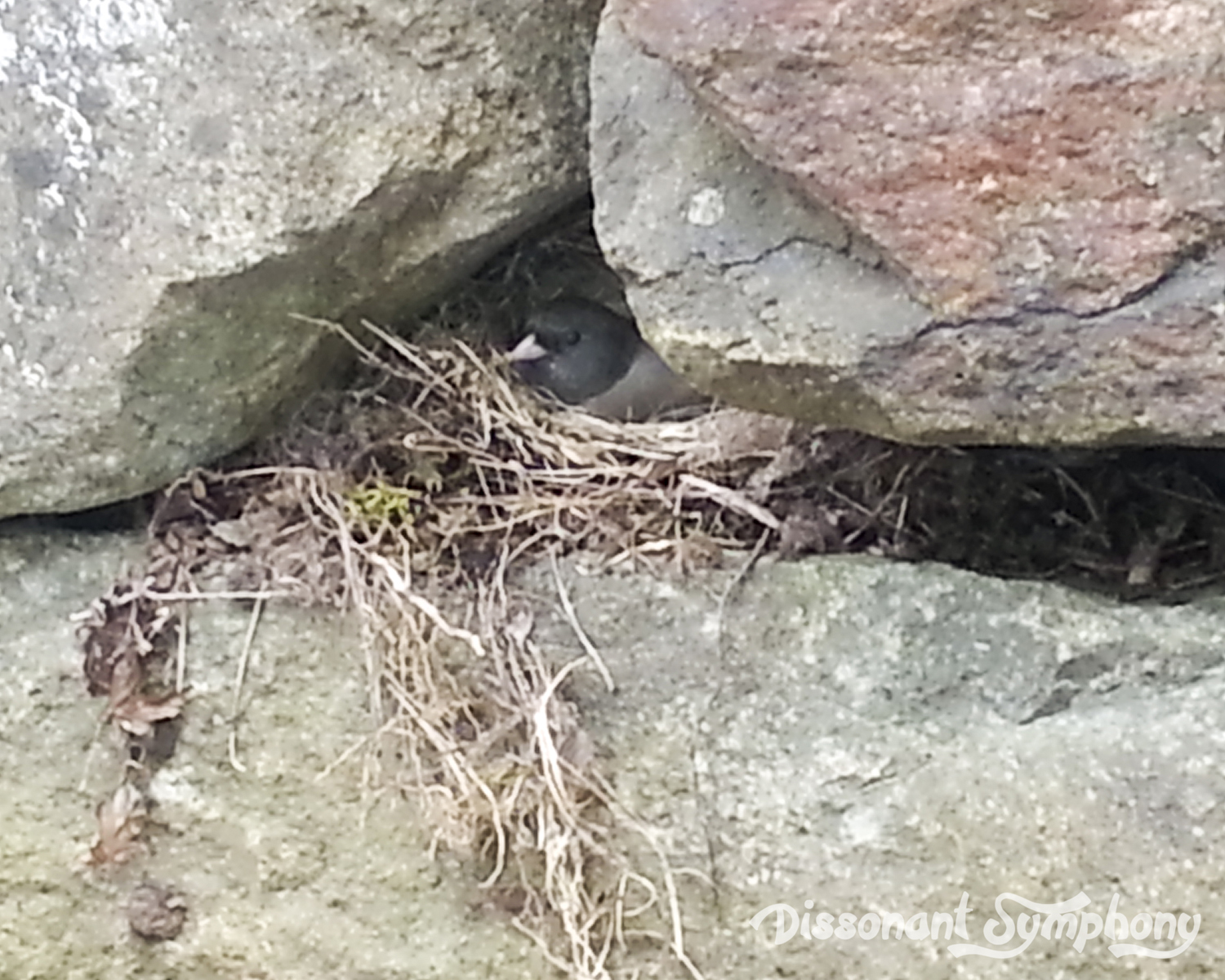 Gazelle has been sticking very close to the nest the past couple days. As in…she’s always on the nest when I take a peek around the rocks. I try not to disturb her as I’m sure keeping eggs warm is serious business. Nobody likes to be bothered at work. Especially this girl. She gets very antsy if I get close to the nest while she’s on it. Which is all the time. All. The. Time. I wonder if birds store up fat for brooding like other animals do for hibernation. She did seem a little, um…fluffy when I took her portraits a couple of days ago. Unless Gazelle has a man bringing her food, I don’t see how she’s getting anything to eat. Poor thing. Growing babies while on a diet? That life is for the birds. Hahahaha!