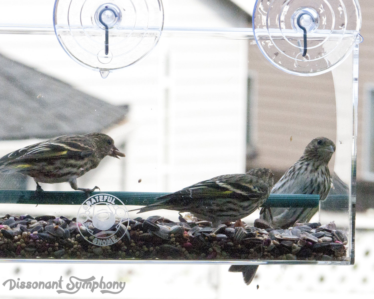 We’ve had quite a lot of action at the feeder, despite the tiny bully bird who most frequently comes visiting and pecks at any bird that DARE encroach on “her” seeds. The bird on the far right cracked me up when I saw this picture. It reminded me of that seal bombing photo that went viral a few years ago. What’s up guys?