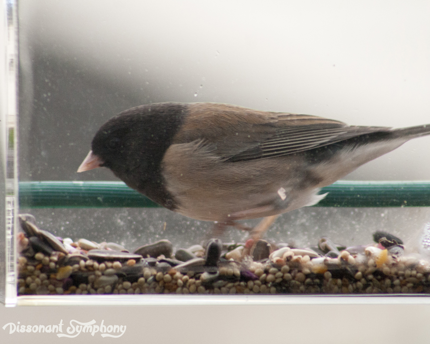 A junco was feasting at our window box this morning. His head was much darker than Gazelle’s. It was almost black, rather than the slate grey of our momma bird. After a few quick clicks of the camera, he was gone, joining a lighter headed junco on the fence bordering our rockery.