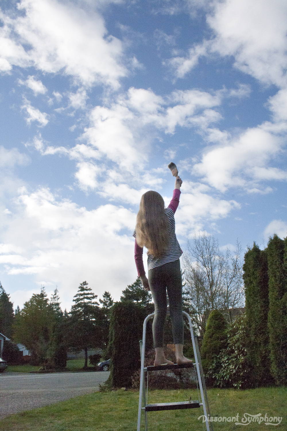I took a photo of the rainbow art, and layered it over a photo of my daughter holding a paintbrush. She was a good sport, but had no idea why I wanted her to stand on a ladder in the middle of the yard holding a Statue of Liberty pose.