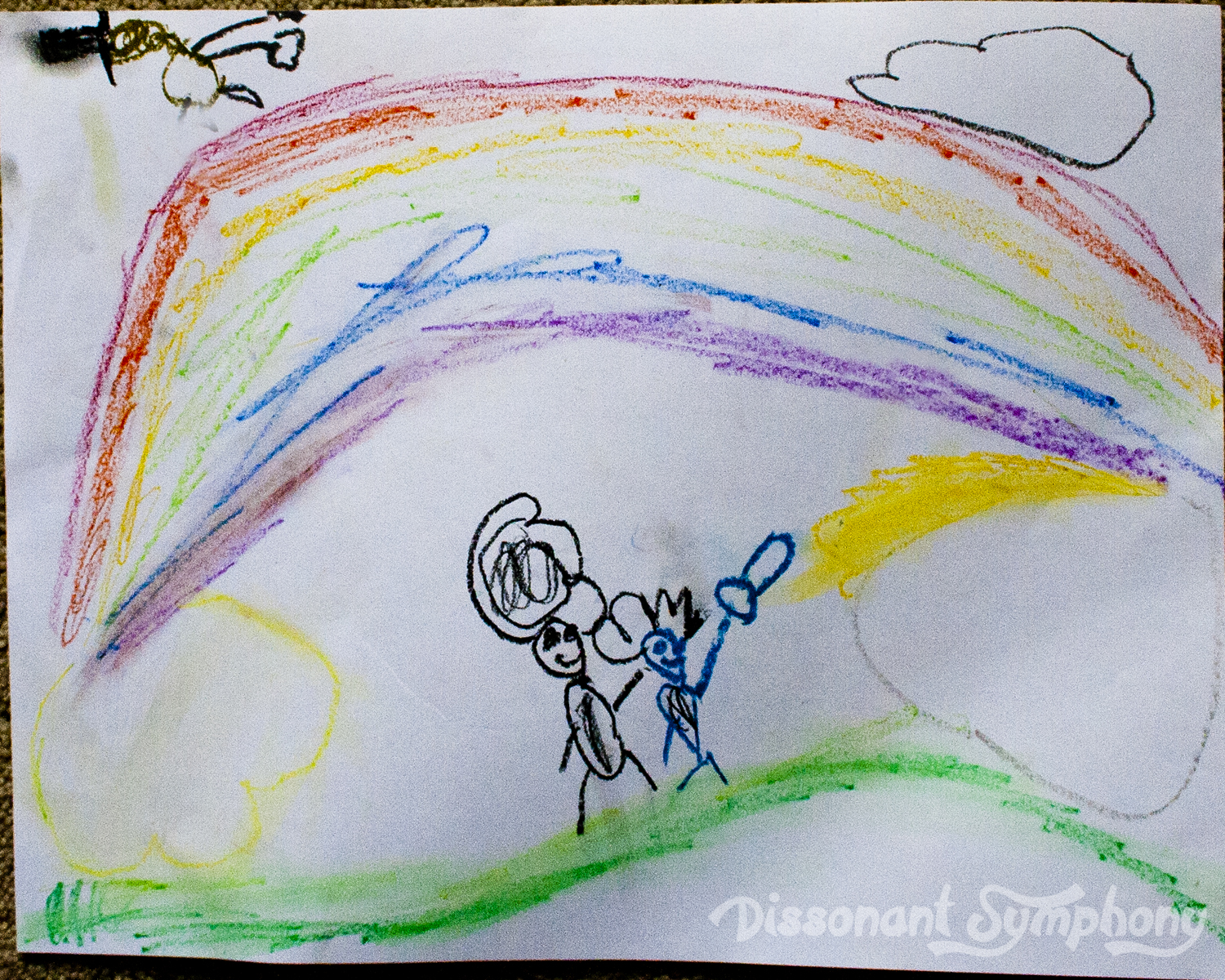 I used a pastel rainbow drawing created by my son. Is it just me, or does that blue person look like they are holding a chainsaw? I had this already, as rainbows are a frequent subject of our drawings/paintings. Feel free to use watercolors, crayons, markers, pastels (we LOVE pastels), colored pencils, chalk…just about any art medium will work.