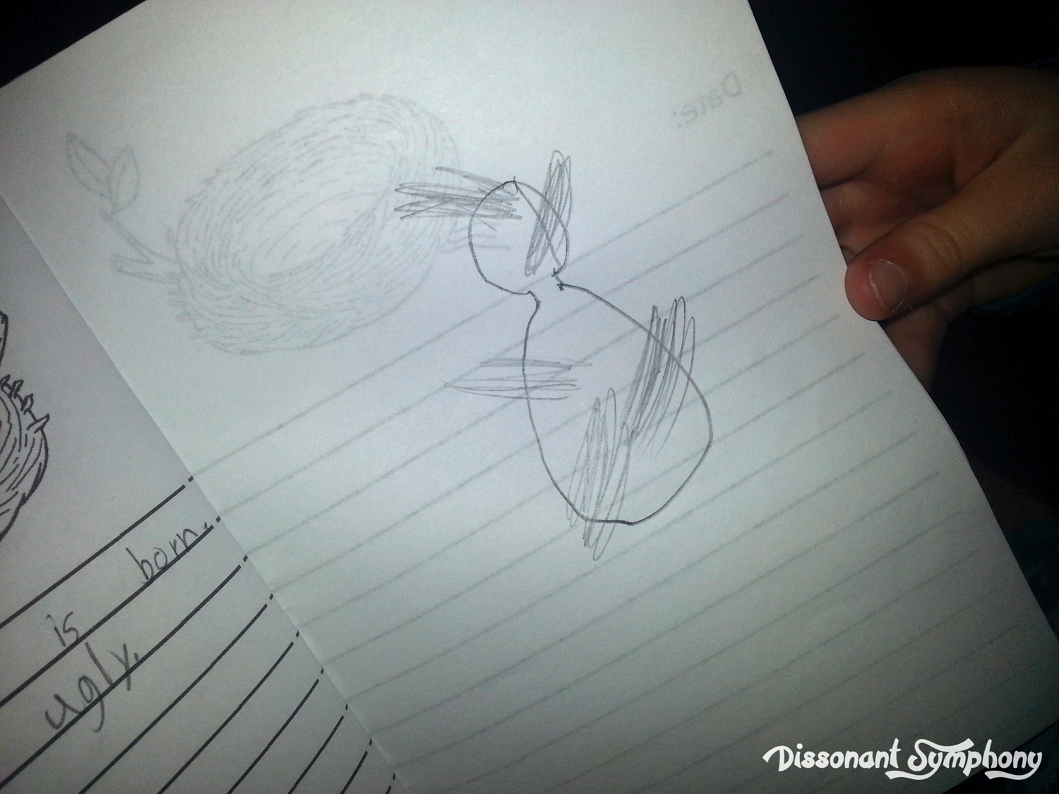 “Is it dead?” my daughter asked as I snapped a single picture. How do I answer her? I honestly don’t know. It didn’t move while we were gazing at it, but then again, we weren’t looking very long. We skedaddled quickly as Gazelle returned, hopping angrily along the fence line where we stood. This momentous event warranted a whole two lines in the bird journal. “A baby bird was born. It is very ugly.”. Madison also sketched this remarkable likeness of the baby.