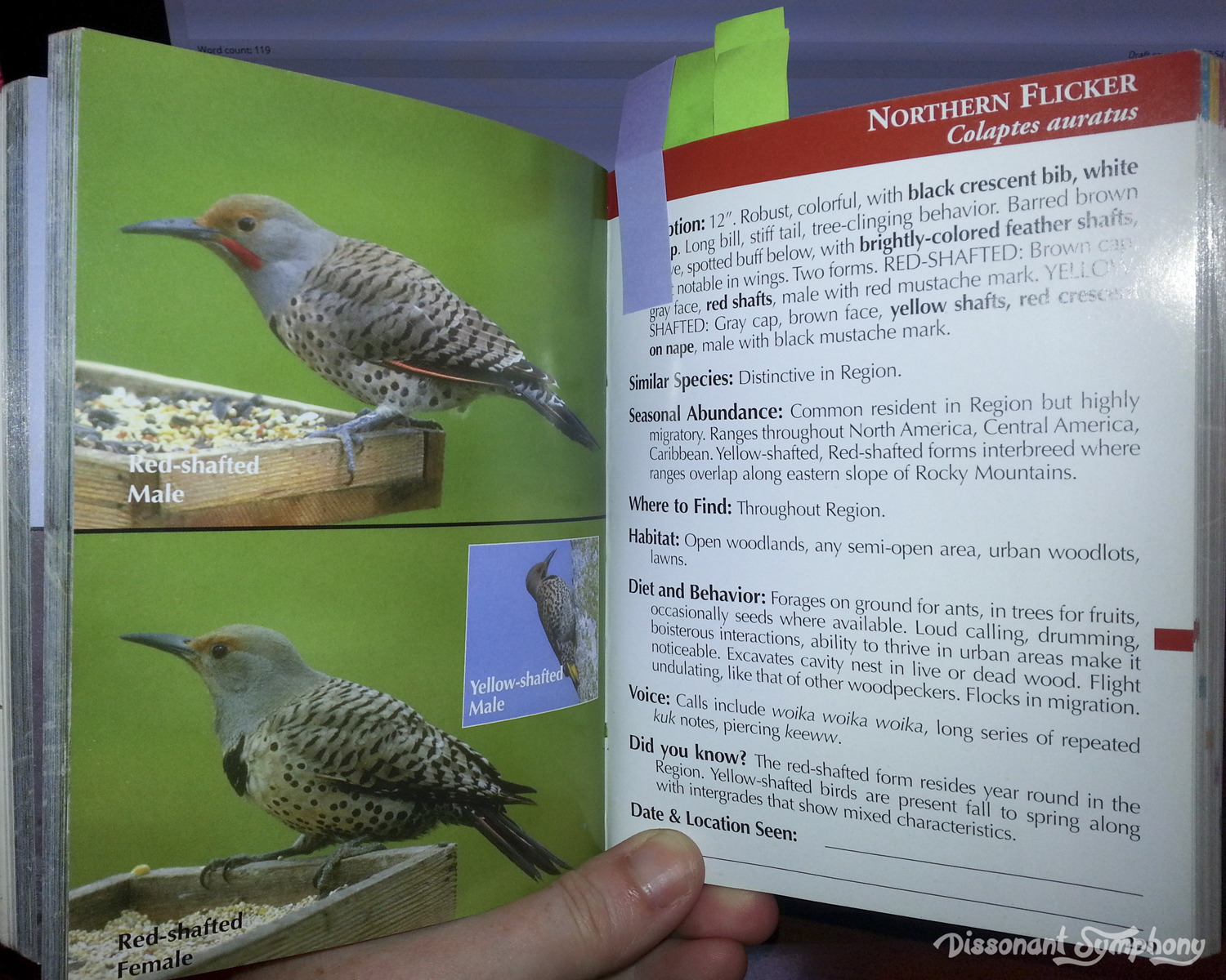 The kids search the full color photographs to figure out the breed and mark each bird’s page as they visit. There’s also good basic information and distinctions on most birds for male/female.