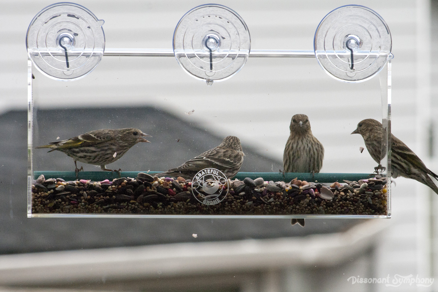 With one simple feeder, our yard has become “a paradise for birds” says my daughter. I can’t say that I disagree. They’re like white on rice! We’ve observed more birds flocking to our yard in a week, than we’ve seen in nine previous years. Pine Siskins and Chickadees are the most common feeders, but few new friends were spotted in the past couple days.