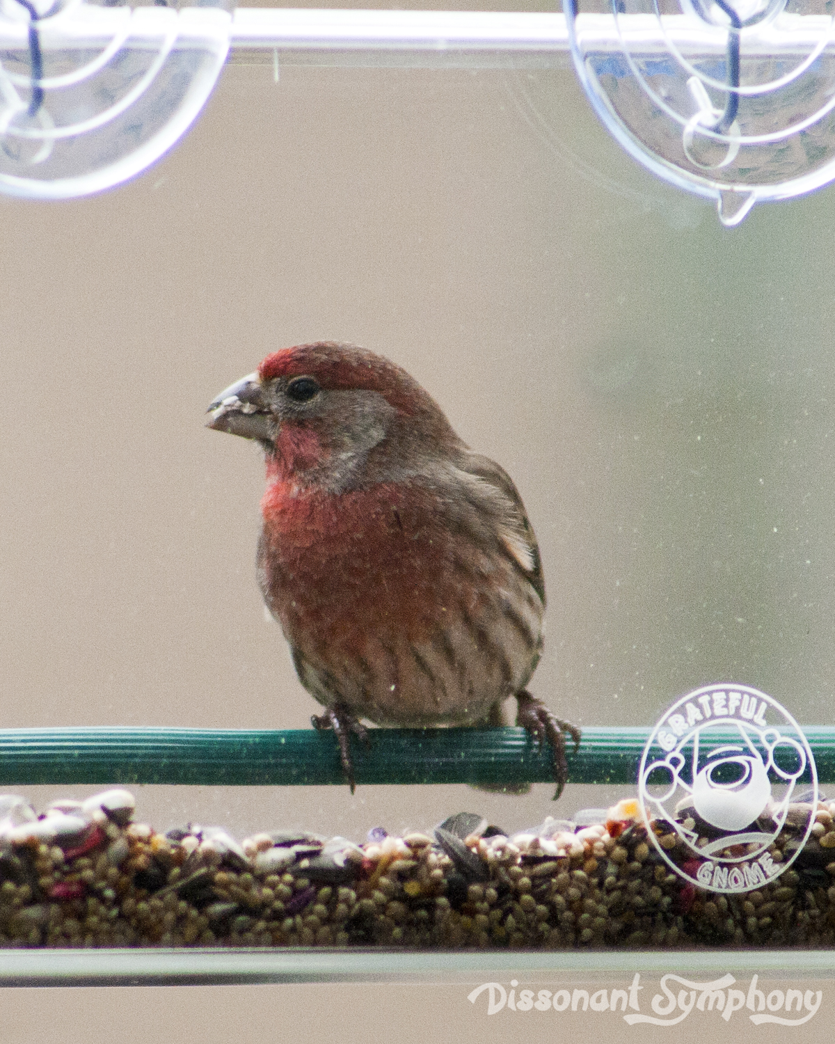 Since our bird feeder is right against our window, it’s become a normal part of our day to spy on birds. The kids actually remind me of the dog Dug from the movie “Up”. Only instead of shouting “squirrel!” in the middle of a sentence, it’s “BIRD!”. Look! An actual House Finch!