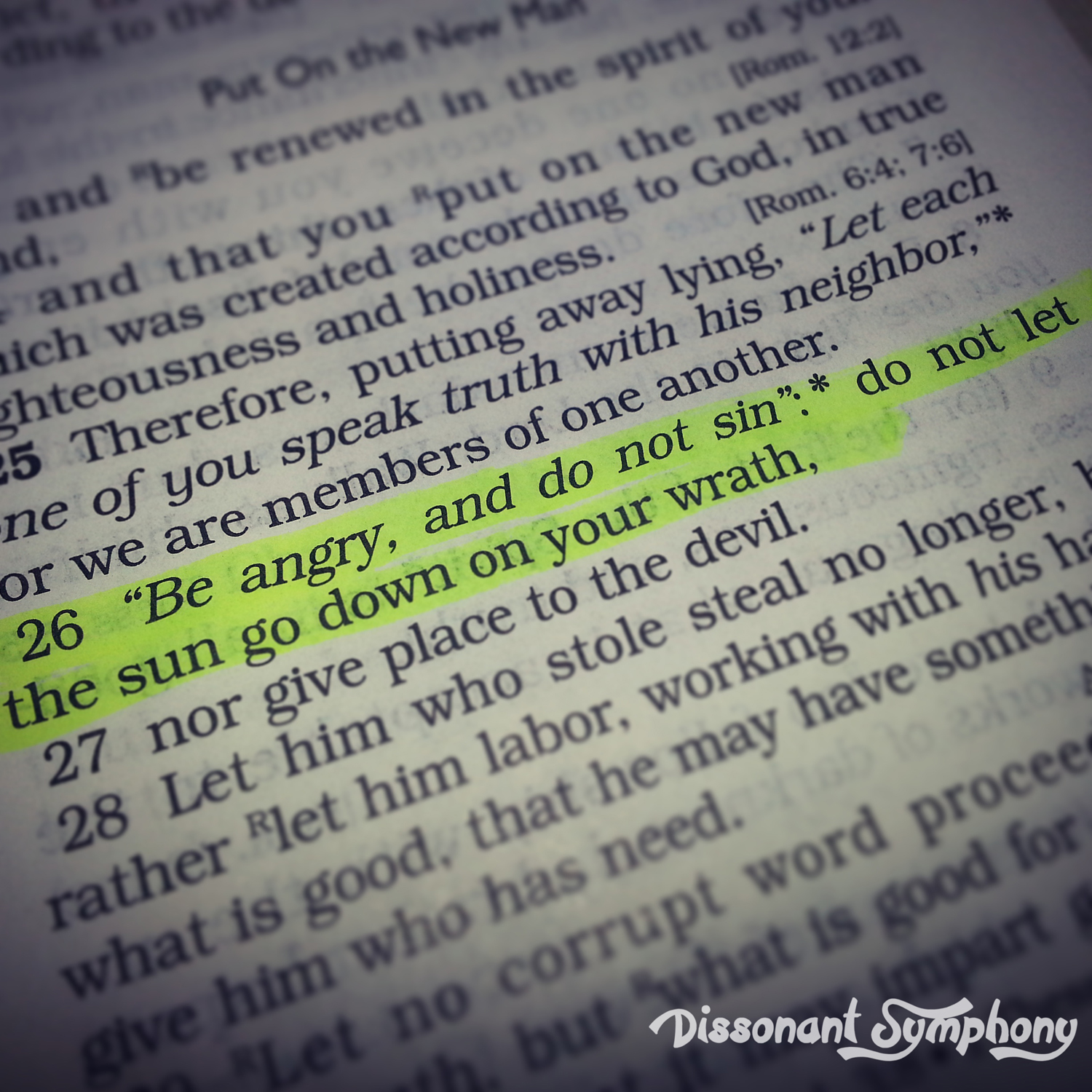 However, these verses call me to be slow to speak, quick to listen and slow to wrath. Beyond that, if I want my heart to be renewed and reshaped into more of the righteousness of God, anger is not the way to get there. Now, notice the verse doesn’t say “don’t be angry ever”. Or “wrath is evil”. Not “shame on you for getting upset”. In fact, Ephesians 4:26 reads “Be angry and do not sin: do not let the sun go down on your anger.”. That’s practically permission to be angry. Or, at least an acknowledgement that you will be. Call it what you want. Irritation. Exasperation. Indignation. Outrage. All natural human emotions. Nothing to feel guilt or shame over. It’s going to happen. What you do with those feelings is what counts.