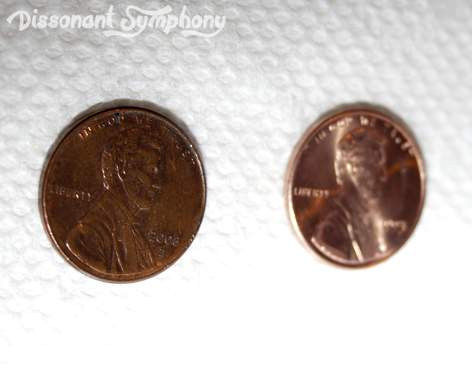 3) Write down a quick description of how the penny looks before the experiment. Drop the dirty, tarnished, oxidized penny into the bowl. You can unplug your nose for this step.
