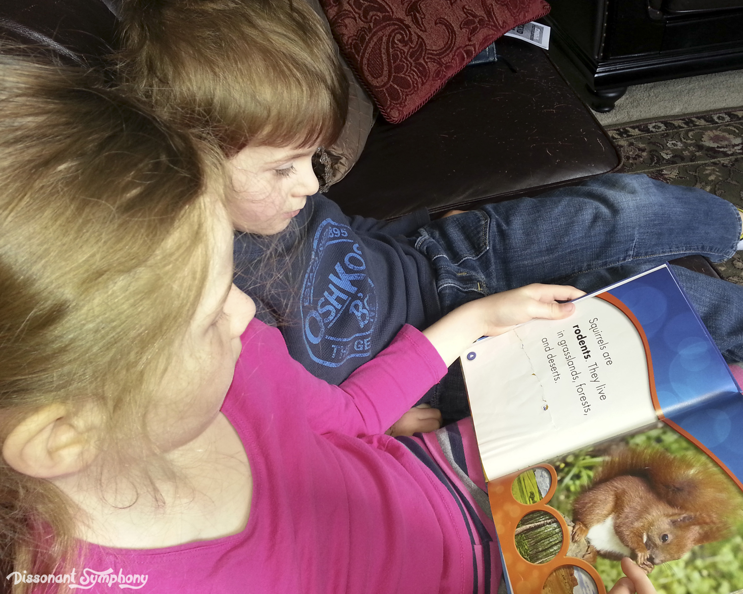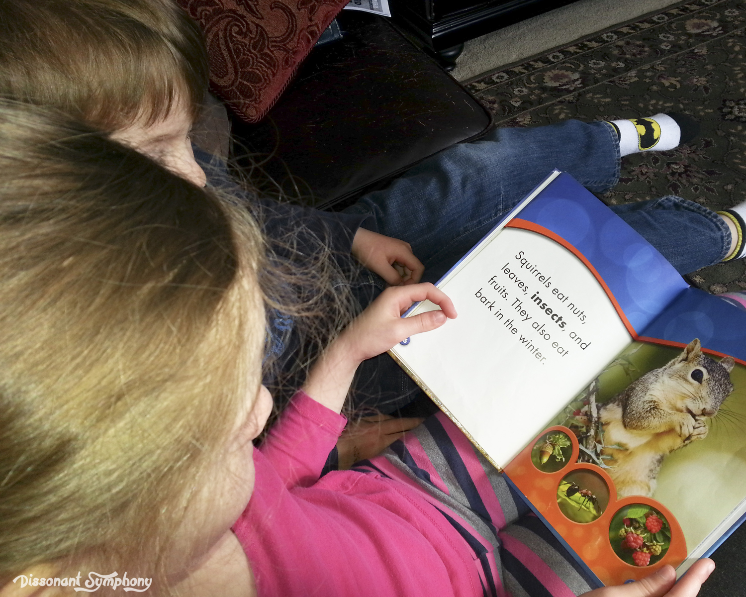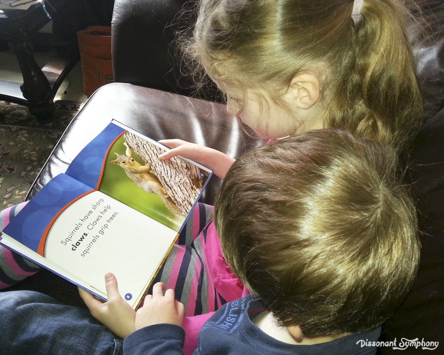 Leigh goes on to describe how building the brain’s knowledge store works and how facts and data are then shelved along with associated information. But I’d like to give you a real world example of this grocery store of the mind and how kids naturally shelve items to pull from at a later time as they memorize information. Today, my kids and I read a book about squirrels. Just a little Scholastic non-fiction early reader we picked up from the library last week. Nothing earth shattering or really very impressive. Just a simple book with basic facts about squirrels.