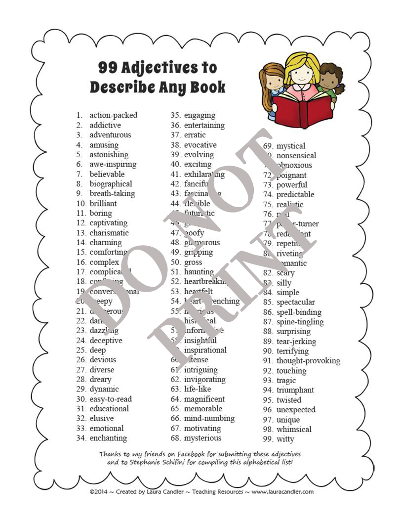 You select an adjective from the list below, or come up with one of your own, then fill in a detail supporting that adjective as a description of the book you recently completed. Continue until you’ve filled in 5 attributes and sentences.