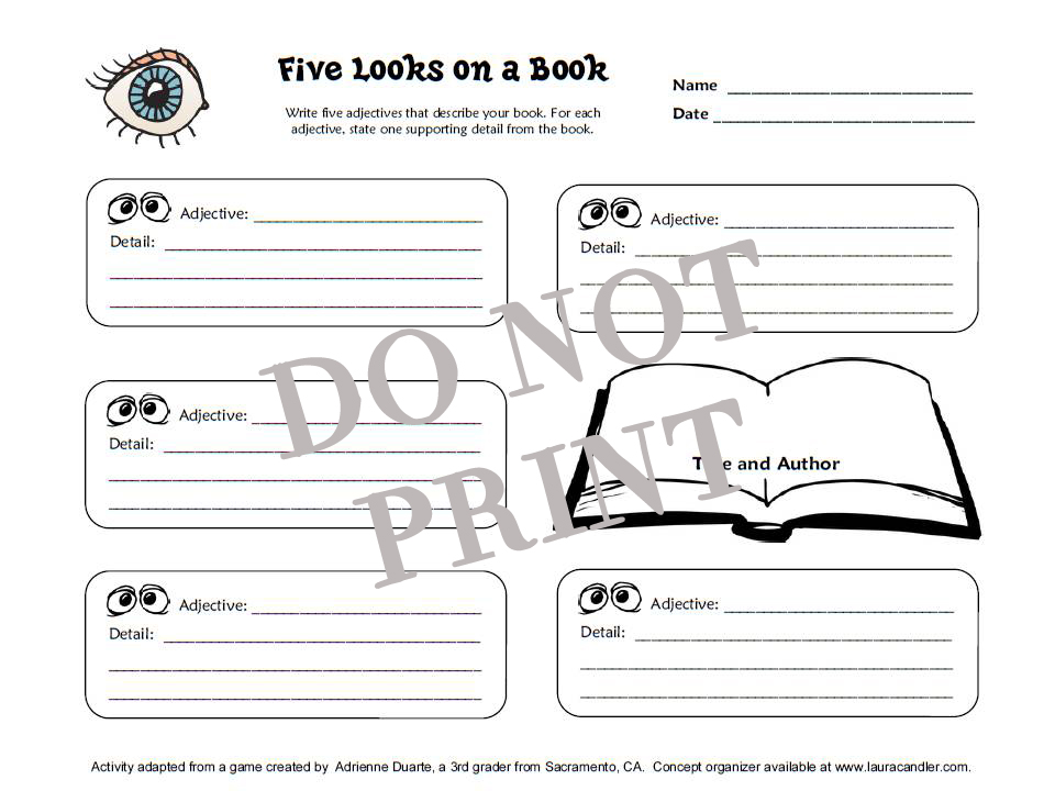 This strikes me as a quick and easy way to get the flavor of what your student thought of the book, without a long drawn out report. Madison’s adjectives have provided me with a good jumping off point to delve into a deeper conversation about her thoughts. Since she reads constantly, I needed something simple enough to apply daily without overwhelming her. 5 Looks on a Book is going to work beautifully.
