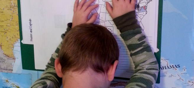 The hilarity of homeschooling never ceases to tickle my funny bone and drive me to a deeper walk with the Lord. When we memorized our states and capitals earlier this year, I made some copywork and maps for the kids to practice on. My son’s assignment this particular morning was to color in the 5 states we were working on, and trace/write each state and capital on the lines below his unlabeled map.